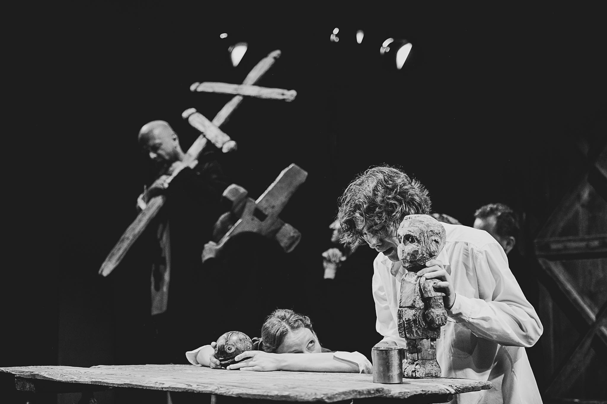Kreowane postaci są przerysowane, by jak najlepiej oddać soczystość charakterów, ich barwność i wyjątkowość. Aktorzy nie boją się śmieszności czy karykaturalności w niezdarnych gestach, dzięki czemu wyraziście rysują sylwetki każdego z bohaterów. Bartłomiej Bazyluk, odtwórca głównej roli, z łatwością wciela się w wiejskiego chłopaka, grając całym sobą — bardzo emocjonalnie i poruszająco. Towarzyszy mu Katarzyna Ogrodniczak (Ziarenko), której kreacja mocno zapada w pamięć. Magdalena Dąbrowska w roli Baby z dużym poświęceniem broni swej bohaterki, podobnie jak jej sceniczny mąż — Patryk Ołdziejewski. Rafał Gąsowski jako Czort z wyczuciem łączy elementy powagi i groteski. Obdarzona pięknym tembrem głosu Katarzyna Wolak-Gąsowska umiejętnie wydobywa głębię postaci Święciuchy. Dariusz Matys jako Starzec jest znakomity, podobnie jak Adrian Jakuć-Łukaszewicz w roli Harmonisty.