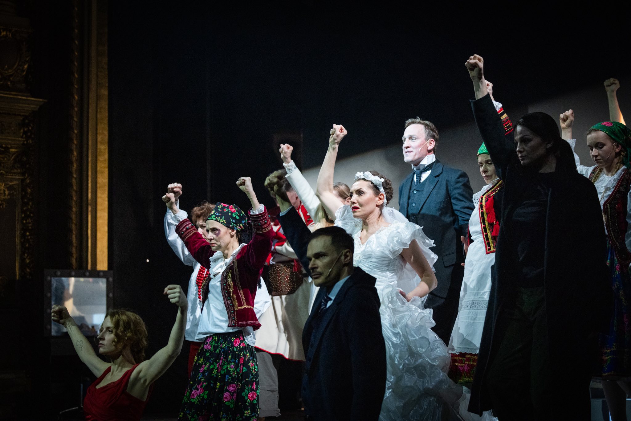 Oglądamy więc spektakl składany w całość na ostatnią chwilę, konstruowany metodą prób i błędów, przymiarek i mniej lub bardziej godnych zaakceptowania przez Kleczewską rozwiązań. Jednak niektóre z nich budzą wręcz uśmiech politowania. Reżyser (Krzysztof Głuchowski) wkraczający dumnym krokiem jako Joker w wersji z filmu Todda Phillipsa i próbujący się uwiarygodnić jako spiritus movens widowiska, które miałoby za zadanie spośród wszystkich polskich widowisk najwięcej o Polsce powiedzieć? To dowód bezradności i absurd nie do obrony, nawet jeśli będziemy się wykłócać zarówno o prześmiewczą siłę teatru, jak i nieraz koszmarne oblicza narodowego imaginarium.