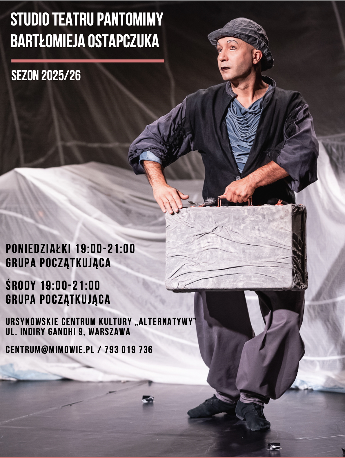 13 października rozpoczyna się 22. sezon Studia Teatru Pantomimy Bartłomieja Ostapczuka. Studio Teatru Pantomimy to przestrzeń odkrywania możliwości ciała, sposobów ukazywania emocji i narracji poza słowem. Warsztaty ukazują bogactwo i głębię tego rzemiosła, prowadząc uczestników w fascynującą podróż po teatrze świadomego milczenia. To miejsce spotkania pasji, świadomości i ruchu, w którym uczymy się słuchać siebie, partnera scenicznego i przestrzeni.