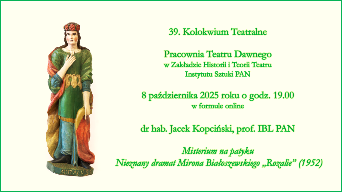Pracownia Teatru Dawnego w Zakładzie Historii i Teorii Teatru Instytutu Sztuki PAN serdecznie zaprasza do udziału w 39. Seminarium Historycznoteatralnym, które odbędzie się w środę 8 października o godz. 19.00 w formule online.