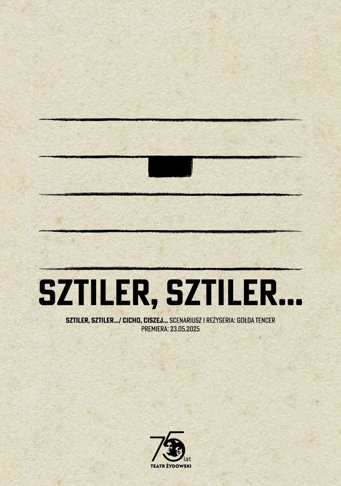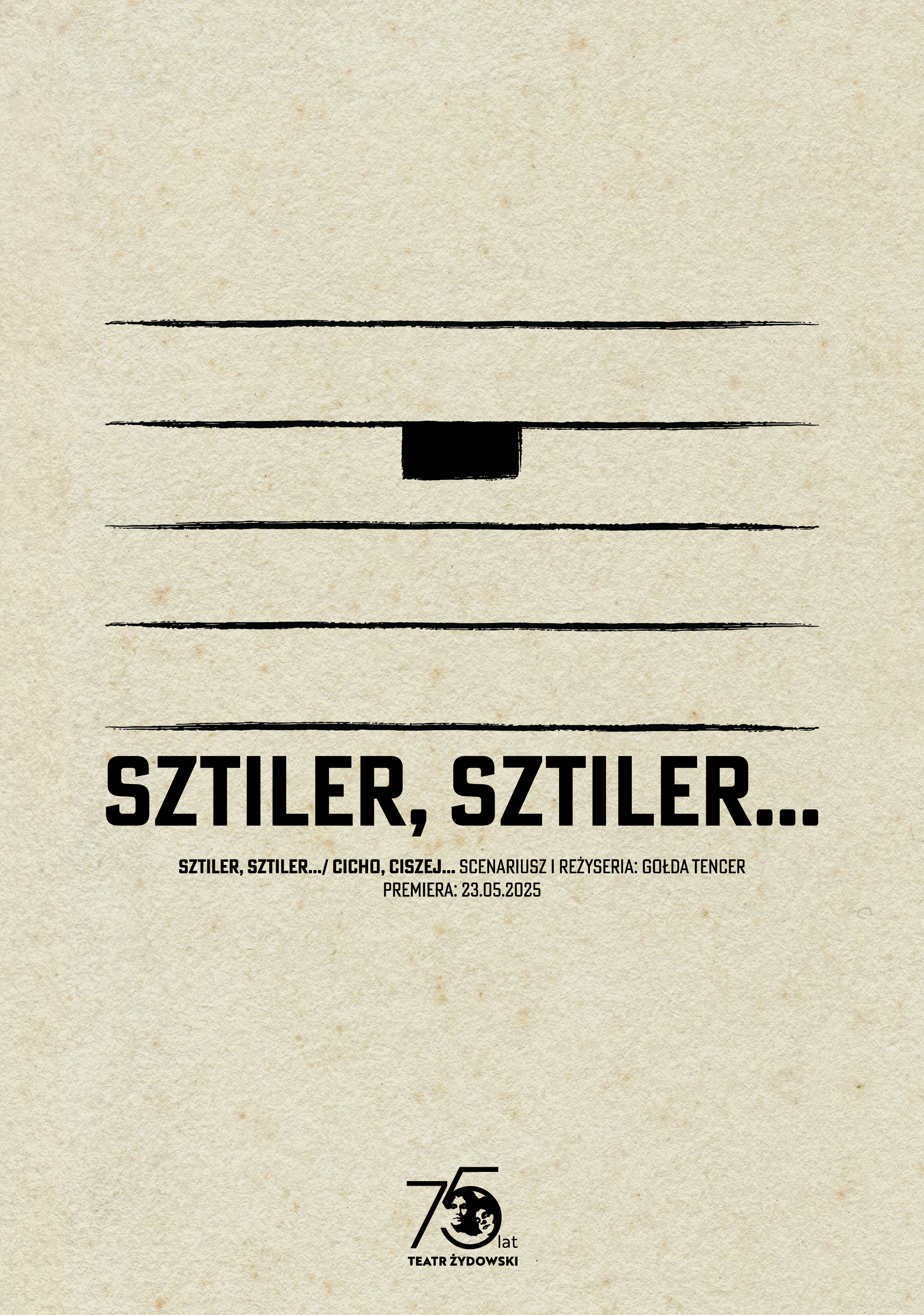 23 maja o godzinie 19.00 na Scenie Kameralnej im. Szymona Szurmieja Teatru Żydowskiego (ul. Senatorska 35) odbędzie się premiera spektaklu muzycznego według scenariusza i w reżyserii Gołdy Tencer „Sztiler, sztiler” (Polska wersja: „Cicho, ciszej…”).