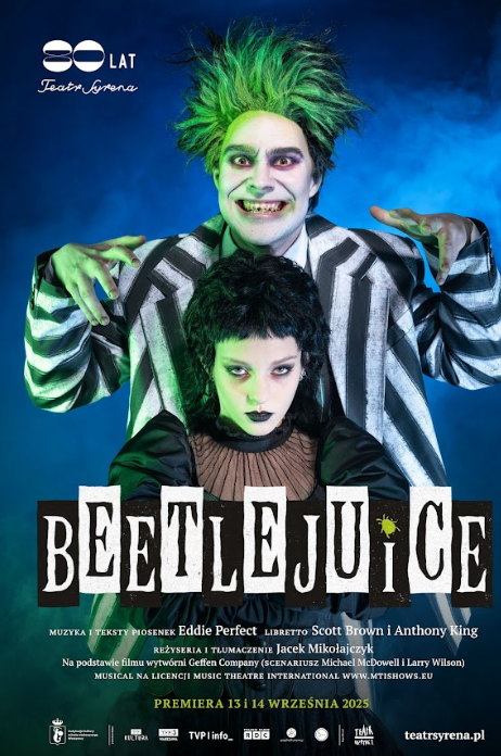 Prapremiera musicalu „Beetlejuice”, który przenosimy do Polski z Broadwayu (amerykański spektakl był nominowany w ośmiu kategoriach do nagród Tony, czyli teatralnych Oscarów), powstaje w koprodukcji dwóch teatrów. To Teatr Syrena (premiera w Warszawie 13 i 14 września 2025 r.) oraz Teatr Rozrywki w Chorzowie (premiera w Chorzowie wiosną 2026 r.).