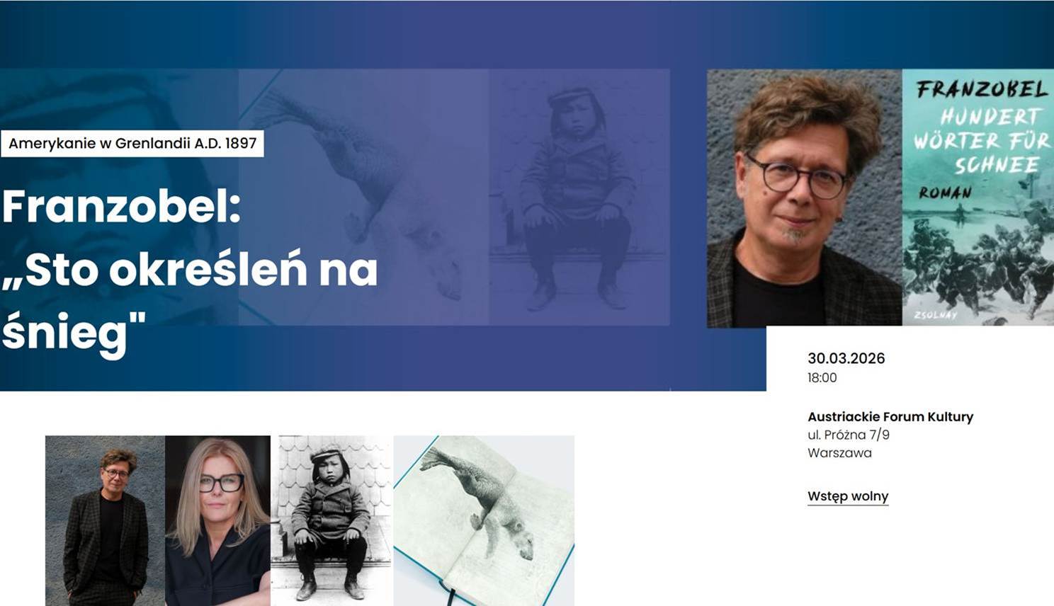 30 marca o godz. 18.00 w Austriackim Forum Kultury odbędzie się spotkanie wokół powieści „Sto określeń na śnieg”/ „Hundert Wörter für Schnee”, której autorem jest austriacki pisarz i dramatopisarz Franzobel – znany polskim czytelniczkom i czytelnikom przede wszystkim jako autor dramatów „Kafka. Komedia”, „Księżniczka Eisenherz” czy „Raj”. Tym razem na spotkaniu opowie o swojej ostatniej powieści.