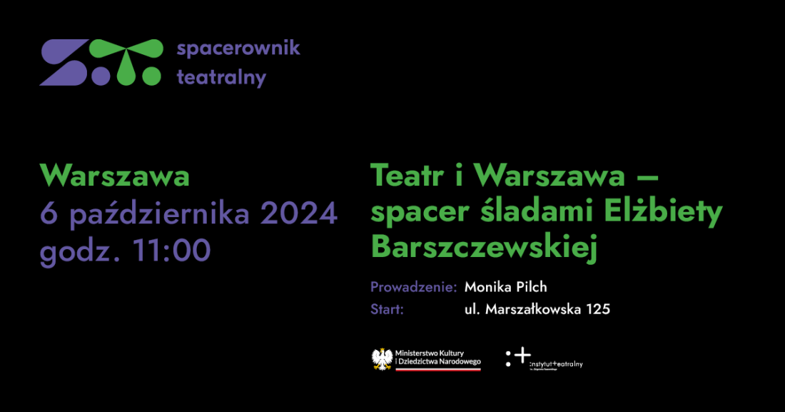 Instytut Teatralny zaprasza 6 października o godz. 11.00 na spacer warszawskimi śladami Elżbiety Barszczewskiej. Po miejscach związanych z aktorką oprowadzi Monika Pilch.