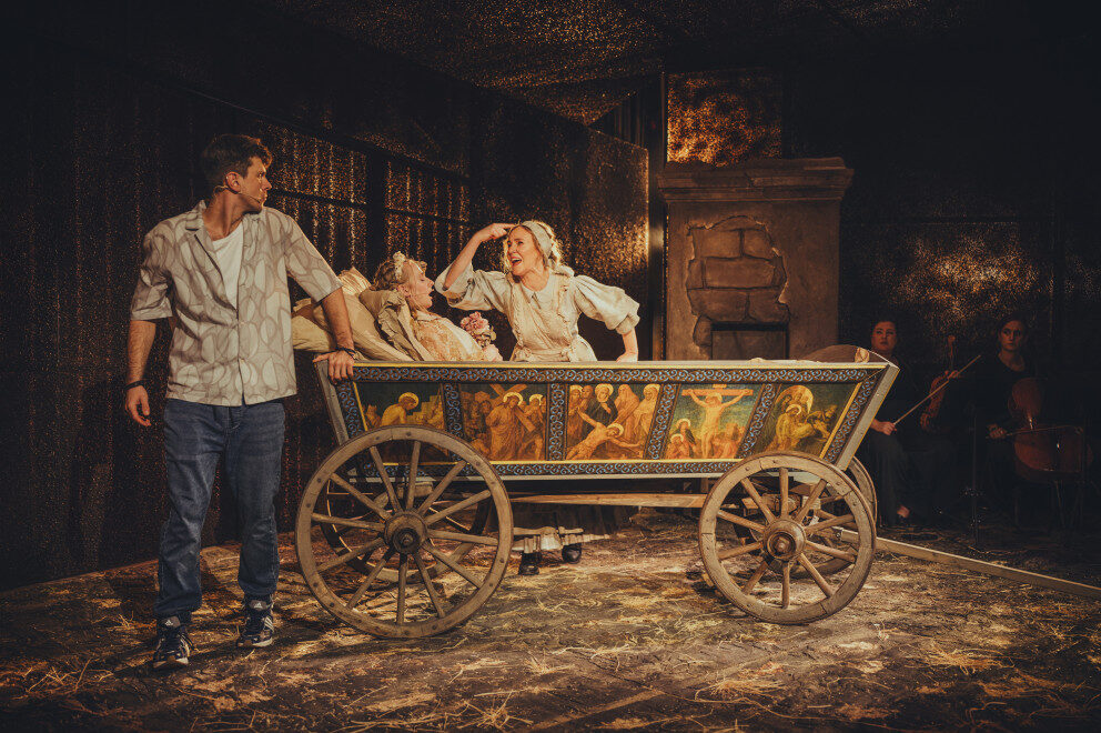Scenografia tworzy sugestywną przestrzeń wiejskiej chaty – zbudowanej z brązów, rdzy i śladów spalenizny, miejscami podmalowanej złotą poświatą. Nad sceną pojawia się błyszczący krzyż – symbol ochrony przed złem, urokami i nieszczęściem. Ważnym elementem scenografii jest także naturalnej wielkości furmanka, która w kolejnych scenach staje się pełnoprawnym uczestnikiem wydarzeń, niemal żywym rekwizytem pamięci.