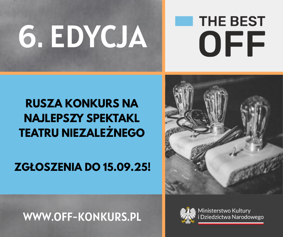 Rusza nabór do 6. edycji Konkursu na Najlepszy Spektakl Teatru Niezależnego „The Best OFF”. Do 15 września można zgłaszać spektakle, których premiera odbyła się nie wcześniej niż 1 listopada 2022 r. – poinformowano na portalu Teatralny.pl.
