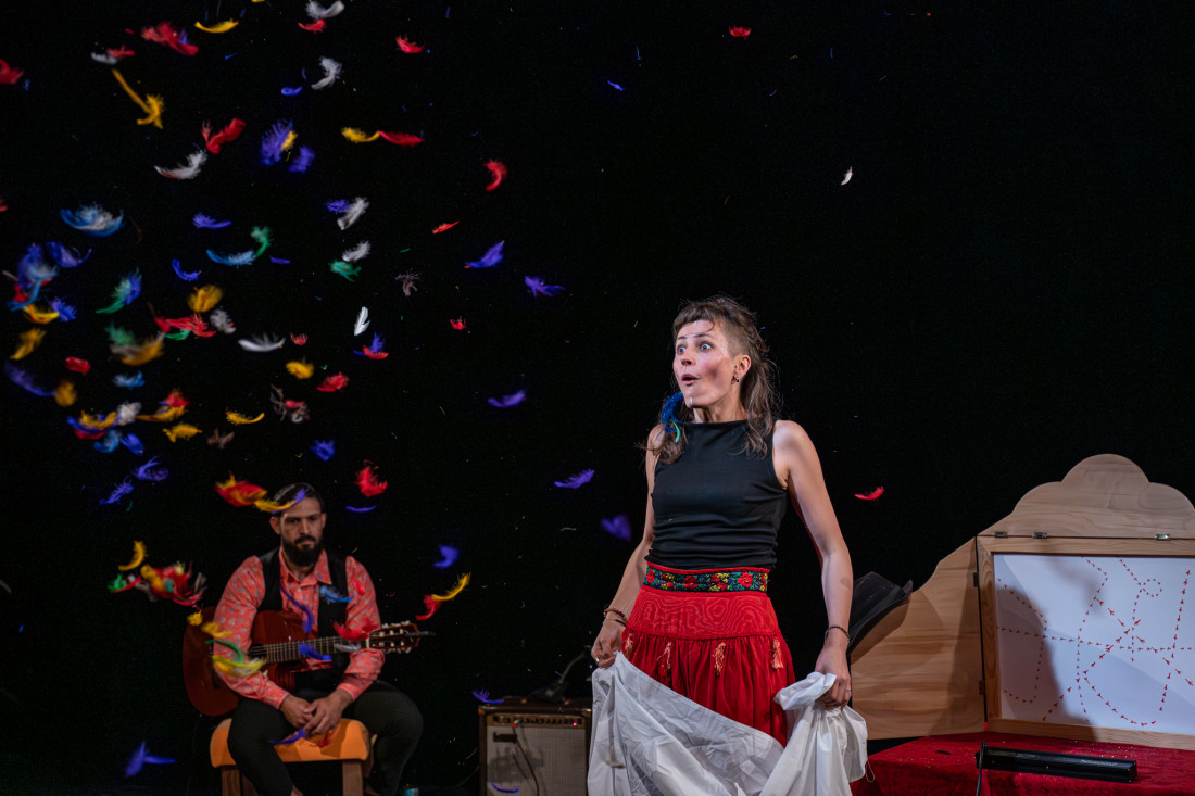 „Siostra ptaków” to poetycki spektakl Teatru Malowanego Piosenkami, inspirowany kulturą romską, opowiadaniem Jerzego Ficowskiego oraz poezją Papuszy. Marta Andrzejczyk i Bartosz Fedorowicz zabierają młodych widzów w podróż przez dźwięki, słowa i obrazy, splecione miłością do ptaków. Historia tytułowej Siostry toczy się w harmonii z naturą i w zgodzie z rytmem zmieniających się pór roku. Wiosną do lasu wracają jaskółki, wilgi i kukułki – to ich głosy towarzyszą pieśniom Siostry. Przychodzi lato, potem jesień i wreszcie zima – ciepłolubne ptaki migrują, a na scenie zostają sikorki, sroki oraz wrony. Ale ptaki nie są tu jedynie tłem. Jako pełnoprawni uczestnicy zdarzeń wskazują drogę Dziadkowi i Jerzemu pędzącym na ratunek, ofiarowują też swoje pióra Siostrze uwięzionej na szczycie wieży. Ptasia współobecność rozgrywa się w spektaklu na wielu poziomach: Andrzejczyk naśladuje ptasi śpiew, rozrzuca po scenie pióra, a formy, które ożywia, przypominają delikatny puch.