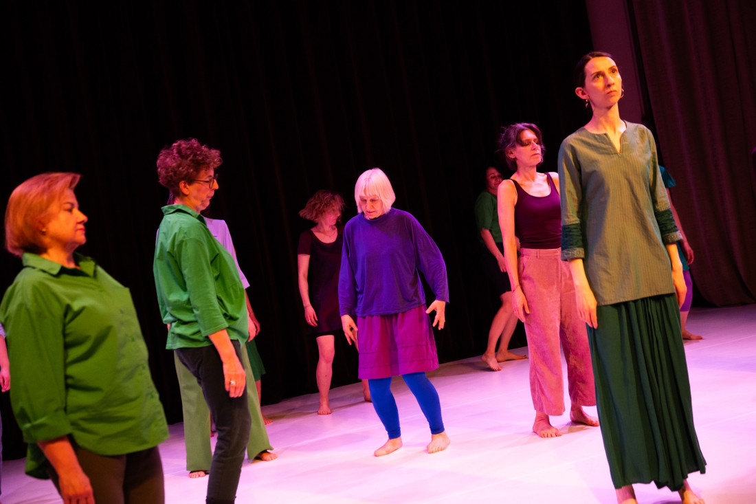 Dramaturgię spektaklu określiłabym jako przeprowadzenie grupy i publiczności od samotności, przez wspólnotowość, po samodzielność i otwartą opcjonalność. Pierwsza scena to długa sekwencja rozgrywających się jednocześnie działań solowych. Performerki swobodnie i głęboko oddychały, aktywizująco podrygiwały, masowały sobie uszy, jakby chcąc uwrażliwić je na werbalne prowadzenie przez choreografkę-improwizatorkę docierające z głośników. Słowa, sylaby, pomruki Bożek-Muszyńskiej prowadziły ku zwiększaniu intensywności ruchu: pojawiały się podskoki, intencjonalnie wywoływane drżenia (tzw. szejki), dynamiczne skręty – wszystko swobodne, ale nieprzypadkowe. Stopniowo z tej multisolowej choreografii zaczęły się wyłaniać wspólne motywy (miękkie, szerokie ruchy, kontakt wzrokowy i dotykowy), a następnie 2- i 3-osobowe podgrupy realizujące własne kompozycje niezależne od pozostałych. Jedne podgrupy działały w miejscu, inne meandrowały między nimi. Role te co i rusz zmieniały się, tworząc migotliwą mozaikę zatrzymań, falowania, kołysania, by następnie przeorganizować duety i tria we wspólną scenę żywiołowej, synchronicznej kompozycji.