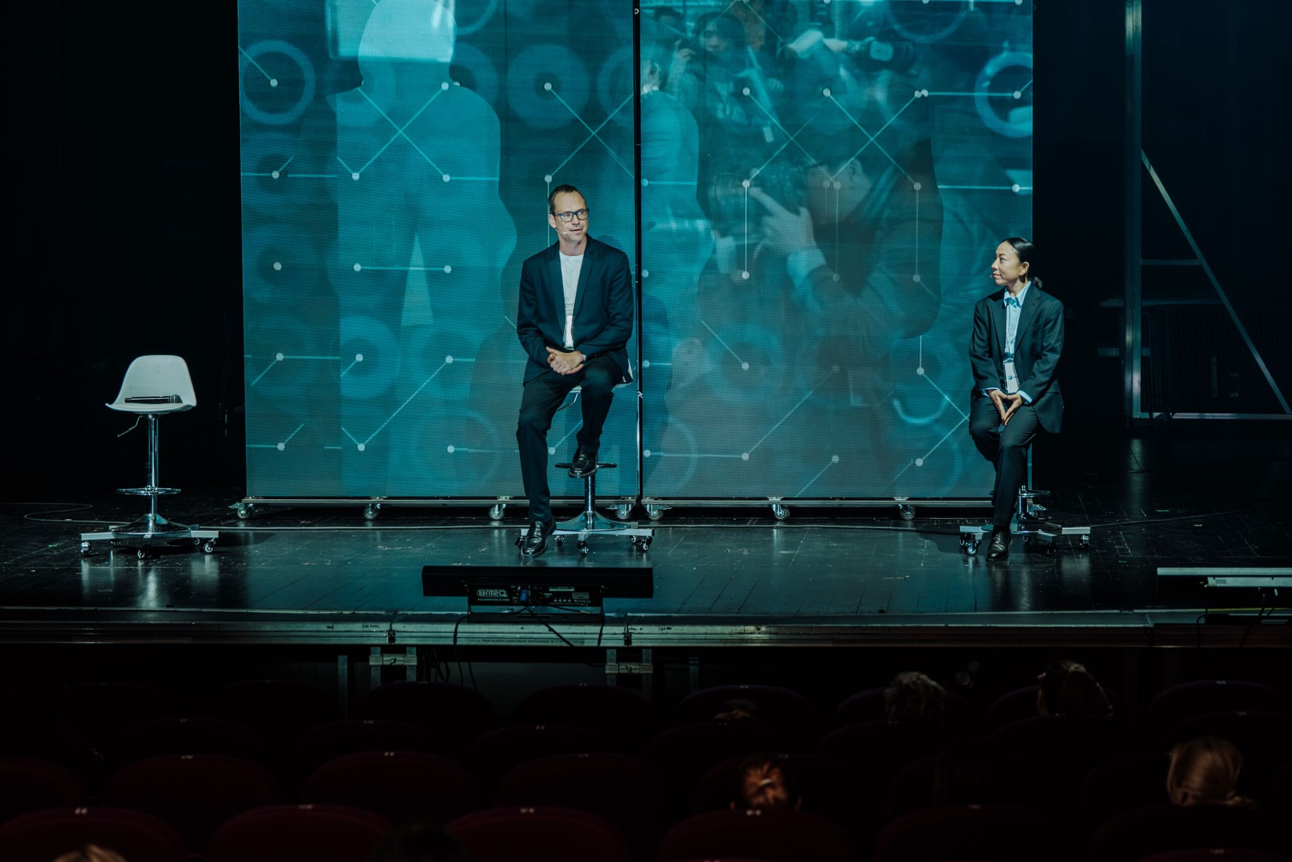 Na scenie Studio odtworzono atmosferę i realia historycznego pojedynku w hotelu Four Seasons. Korczakowska podzieliła publikę na dwie części – tych uprzywilejowanych oglądających z bliska rywalizację człowieka z AI oraz całą resztę widowni mającą do dyspozycji głównie telebimy i obraz z dwóch wędrujących po scenie kamer. Przyznam, że gdyby nie udział w próbie medialnej i końcowe ukłony aktorów gdzieś w tyle sceny w ogóle bym o tym nie wiedział, zaś wygodny fotel na widowni cenię sobie znacznie bardziej niż drewniane podesty dla „VIP-ów”. Może gdyby postawiono tam stoliki i serwowano szampana, a wszędobylskie kamery dały odczuć, że tamci mają faktycznie lepiej? Wizualizacje przygotowane przez Marca da Costę we współpracy z Marcinem „Kitty” Kossakowskim, będące istotnym cyfrowym składnikiem scenografii, pełną garścią czerpią z technologii AI, trochę prześmiewczo ukazując na ekranach olbrzymie zainteresowanie i ekscytację głównie azjatyckich mediów czy już całkiem serio technologię wykrywania twarzy, która jest jednym ze współczesnych narzędzi chińskiej władzy do kontrolowania społeczeństwa. Sam pojedynek relacjonują dla nas dziennikarka Cassidy (świetna Maja Pankiewicz) i asystentka Lee Sedola (Ji Yoon Kang), co łamie już faktograficzną konwencję. Komentują one po polsku i angielsku znaczące momenty spotkania, choć dogłębna analiza 37. ruchu AlphaGo w drugiej grze („a move that no human would've ever made”), czy „boskiego, genialnego tesuji” nr 78 Lee Sedola w jedynej wygranej, czwartej rozgrywce, pozostawiają nas trochę z boku, nawet mimo prób bezpośredniego wciągnięcia publiki w historię. Azjaci traktują grę w go jako formę sztuki, my w znaczącej większości nie znamy nawet jej zasad, a sam spektakl nieszczególnie nam je przybliża.