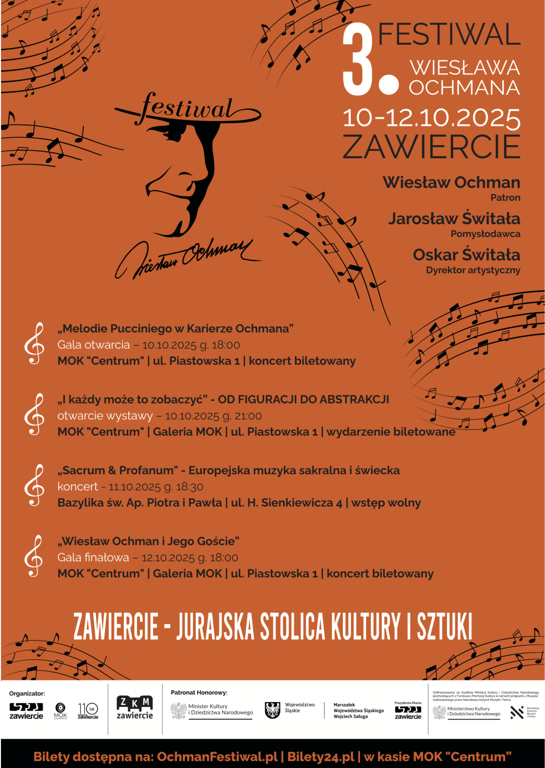 III Festiwal Wiesława Ochmana w Zawierciu odbędzie się w dniach 10–12 października. Przez trzy dni Zawiercie stanie się Jurajską Stolicą Kultury i Sztuki – miejscem spotkania miłośników opery, muzyki oratoryjno-kantatowej i symfoniki z najwyższej półki. Wydarzenie odbywa się pod patronatem Mistrza Wiesława Ochmana, którego dorobek i autorytet nadają Festiwalowi szczególną rangę.